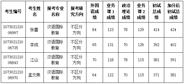 根据《2022年全国硕士研究生招生工作管理规定》,参加“大学生志愿服务西部计划”“三支一扶计划”“农村义务教育阶段学校教师特设岗位计划”“赴外汉语教师志愿者”等项目服务期满、考核合格的考生,3年内参加全国硕士研究生招生考试的,初试总分加10分。我院2022年硕士研究生招生考试一志愿考生张蕾、李成、江山、孟文燕已提供“赴外汉语教师志愿者”相关证明材料,经审核,符合相关加分政策,初试总分加10分,现将相关信息予以公示: